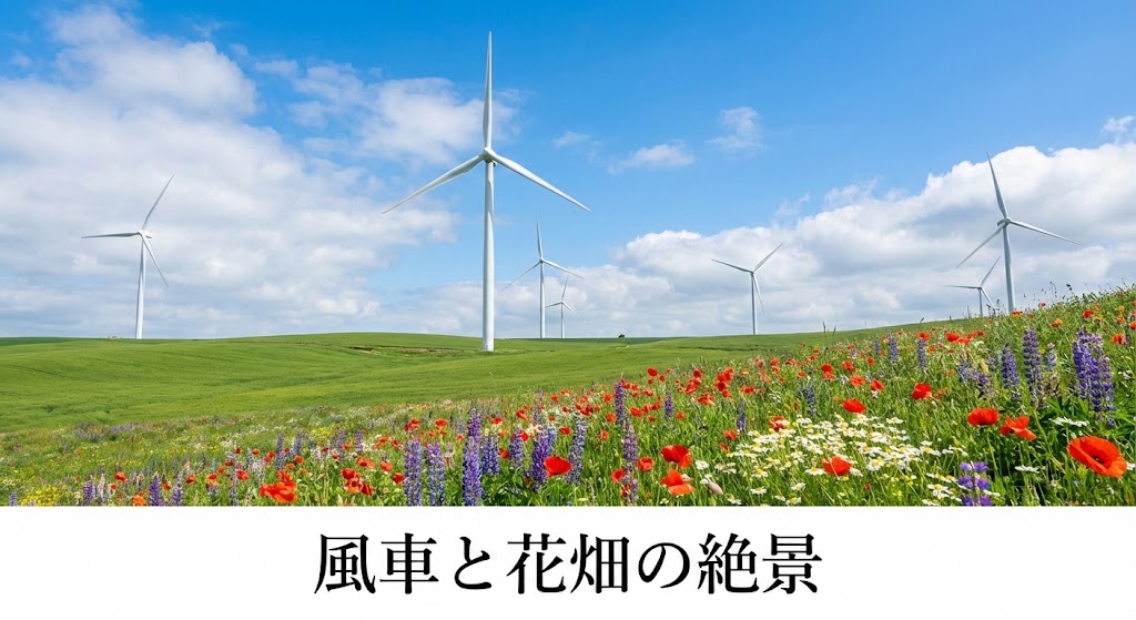 大草原の風車と花畑の絶景スポット