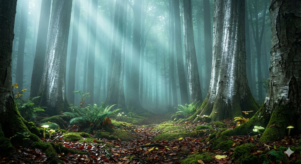 霧の森の最大の魅力は、何といっても「霧と光が織りなす風景」です。朝や夕方、霧が濃くなる時間帯には、木々の合間から差し込む光が柔らかく拡散し、森全体が淡い青緑色に染まったように見えます。銀色がかった樹皮を持つシルバーウッドの幹は、霧にぬれるとほんのり光を反射し、まるで森そのものが呼吸しているかのような印象を与えます。