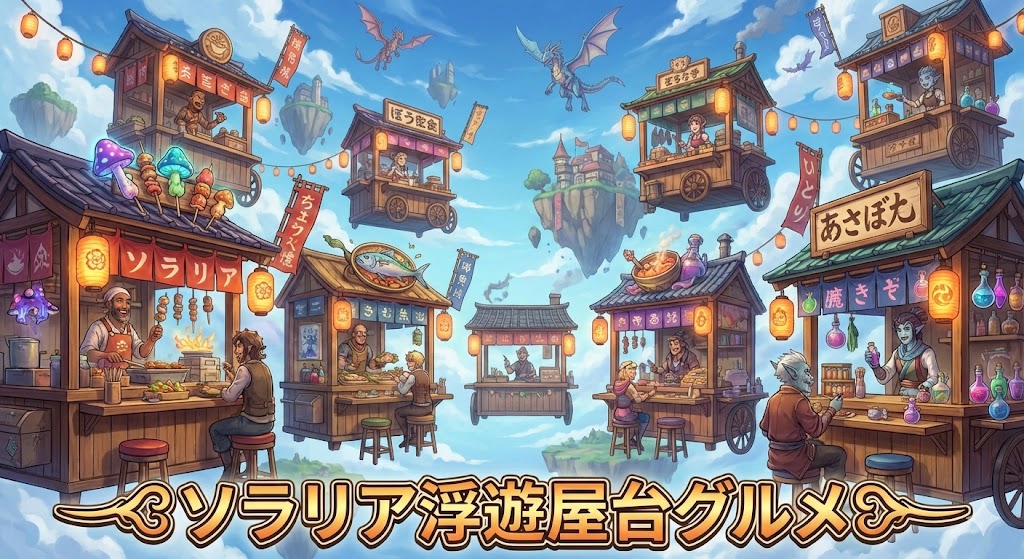 はじめに エルドリア王国の旅案内師、エリアナです。 ソラリアに滞在するとき、私がつい何度も足を運んでしまうのが「空中市場の浮遊屋台」です。 ソラリアの空中市場は、空の旅人たちの胃袋と好奇心を満たしてくれる場所です。地上の市場とはひと味違う「... -