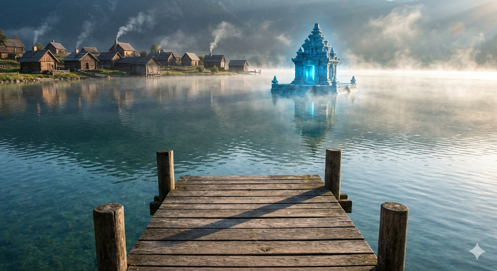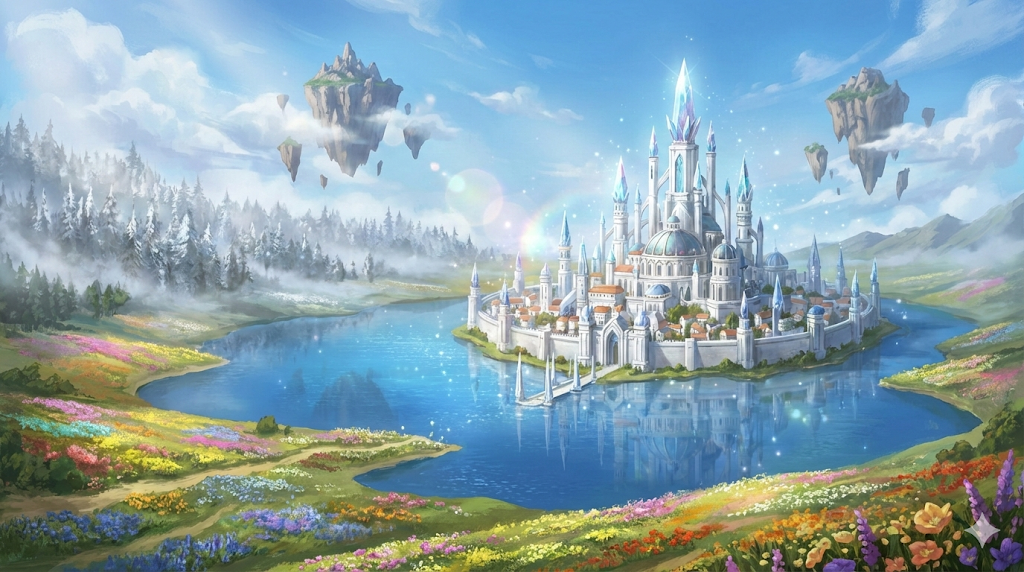 「水鏡に映る、静寂の癒やし」王都の北に位置する、透明度の高い巨大な湖。水面には空が鏡のように映り込み、夜には湖底の「月光石」が青白く輝きます。