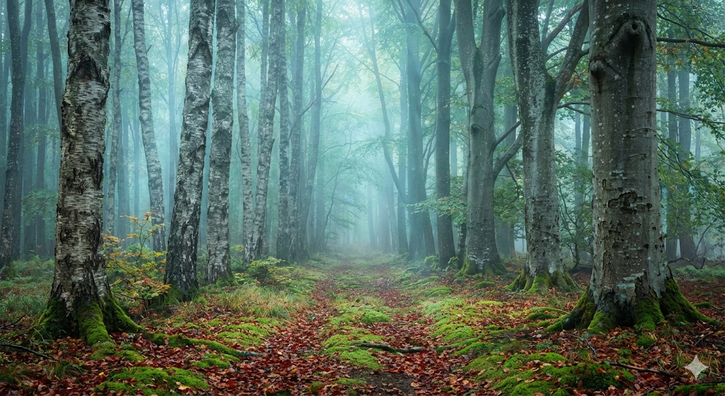 「霧と静寂に包まれた、神秘の森」銀色の樹皮を持つ古代樹が立ち並ぶ、深く静かな森。常に薄い霧がかかっており、森の奥には古い魔法や薬草の知識を持つ人々が暮らしています。